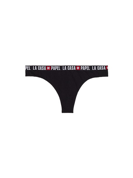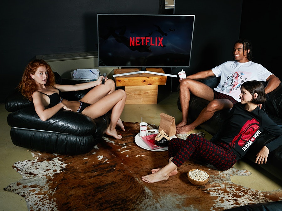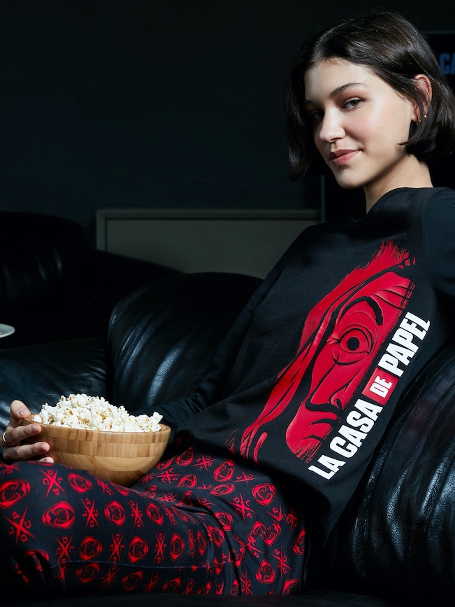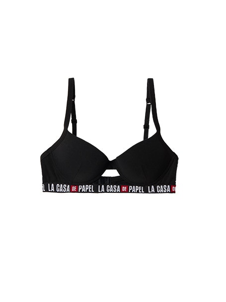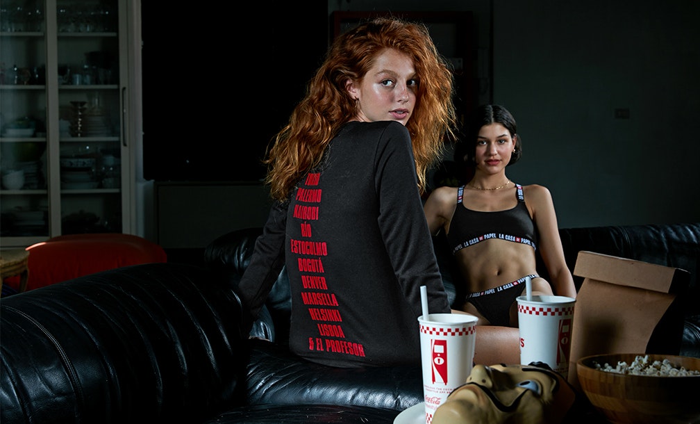 Na irreverente lingerie de mulher, o foco está no logotipo da série da Netflix, enquanto que no underwear de homem a máscara de Dalí é o divertido padrão de referência.